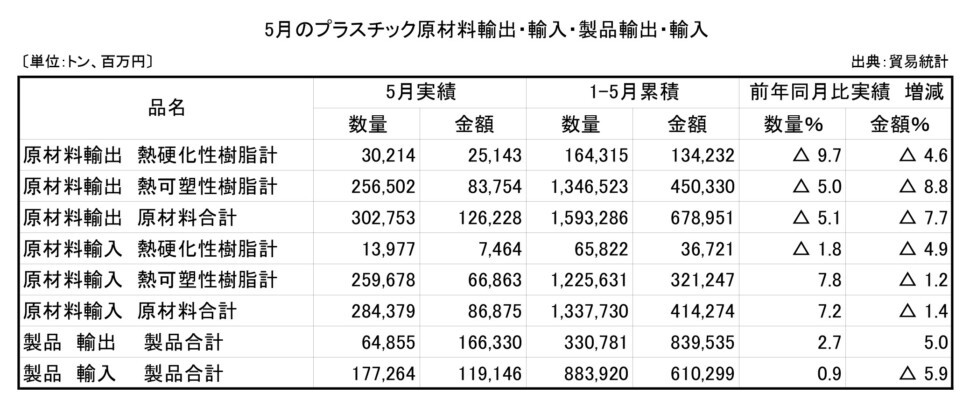 ゴムタイムス社 25年9月プラスチック原材料製品輸出入 原材料輸出の数量は1・7%減 2025年12月1日 11時 日本プラスチック工業連盟がまとめた9月のプラスチック輸出入実績によると、原材料輸出の数量は前年同月比1・7%減の32万3941tとなった。 内訳は、熱硬化性樹脂が同12・1%減で