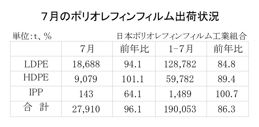 ゴムタイムス社 25年8月のPOフィルム出荷状況 合計は12・6%減 2025年10月27日 13時 日本ポリオレフィンフィルム工業組合のまとめによると、8月のポリオレフィン系インフレーションフィルムは2万4662tで前年同月比12・6%減となった。 低密度ポリエチレン(LDPE)フィルムは、1万6605tで同10・3%減、高密度ポリエチレン(HDPE)フィルムは、7881tで同