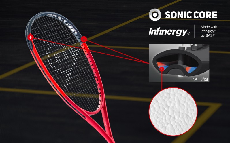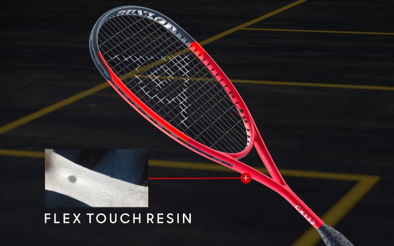 スカッシュラケットダンロップ「CX」シリーズの主な特長は、テニスラケットの基幹テクノロジー「SONIC CORE TECHNOLOGY」搭載で安定した打感を実現している点(高反発ウレタン素材「Infinergy」を、ヘッド部(2時、10時)に搭載することで、反発性、面安定性に優れた軽快な弾き感、打球感を実現する。「Infinergy」を搭載することで、フレームの重さを重くしすぎずに安定感を高めることが可能になる)、柔らかな打球感を実現する「FLEX TOUCH RESIN」を採用している点(スロート部を構成する材料に、高伸縮・高反発素材の特殊スチレン系エラストマー不織布「FLEX TOUCH RESIN」を採用した。これにより、パワーとコントロールの両立を図り、弾き感と食いつき感に優れた打球感を実現する)となる。