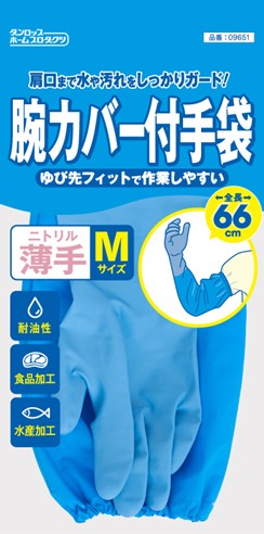 商品特長は、全長66cmの腕カバー(肩口までの水濡れや汚れを防ぎ、快適な作業環境を保つ)、高いグリップ性とフィットする指先(表面処理により、ウエットグリップ性を向上させている。高ニトリルがもつ耐油性能と、低ニトリルがもつ柔軟性を兼ね備えた配合により、柔らかくフィット性にも優れている。また、耐油性も兼ね備えている)、はがれにくく高強度(手袋と腕カバーの接合部の強度を高め、引っ張ってもはがれにくい仕様)となる。
