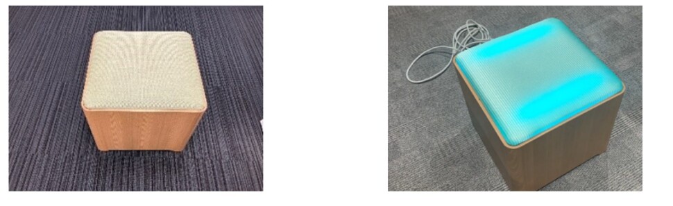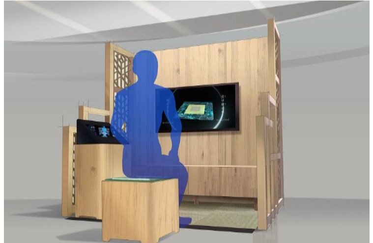 展示スペースでは、ウィドゥ・スタイルが製作する和空間をイメージした造作(ぞうさく)や日本古来の伝統畳の高級イ草の風合いと樹脂製の高い機能性を併せ持つ樹脂製畳「MIGUSA」を用いたスツール(一人用椅子)を設置する。スツールには、同社の介護向け離床・起き上がりセンサー「アンシエル」のセンシング技術を用いて、座った方のバイタル情報を測定し、裸眼3Dモニターに表示させることで、未来の健康管理を疑似体験できる。