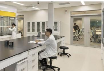 建物中央部に、吹き抜けや中間階(ステップフロア)、打ち合わせスペースを設けることで、部門や領域を越えた偶発的な出会いや日常的な対話と議論を創出している。また、実験室を執務室と隣接させることで移動を効率化し、またガラス窓を多用することで視認性の高さを実現している。