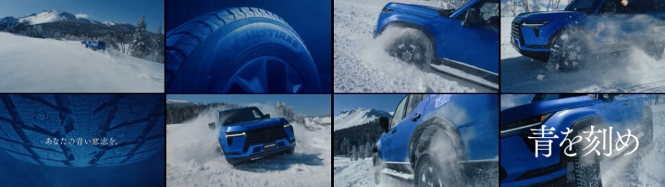 今回は冬篇として、同社製SUV専用スタッドレスタイヤ「OBSERVE GSiー6」を装着した「LEXUS GX 550」が、同社の主力市場であるアメリカの雄大な雪山を力強く駆け抜ける姿を描いている。6月に制作した企業CFに続き、楽曲にはアメリカのロックバンド「ドゥービー・ブラザーズ」が1973年に発表した世界的ヒットソング「Long Train Runnin’」を採用。コーポレートカラーの「青」を基調に、雪原を舞台にしたダイナミックな走行シーンを通じて、ブランドステートメント「まだ、走ったことのない道へ。」が象徴する同社グループのフロンティア精神を、力強く印象づける内容に仕上げた。
