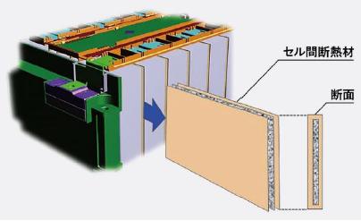 展示品の「電池セル間断熱材」は、薄膜高断熱材「ファインシュライト」の技術をさらに発展させ、軽量かつ数百℃の高温に耐えられる断熱材をリチウムイオン電池向けに開発した。セルの膨張収縮を吸収する圧縮特性と、セルが異常発熱した際には隣接するセルへの熱連鎖を抑制する断熱性能で、電池の安全性と長寿命化に貢献する。
