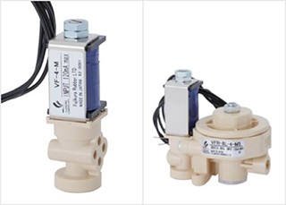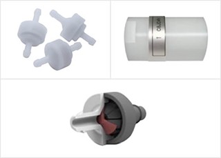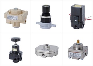 「制御機器」では、高精度、高品質が要求される医療機器にて長年の採用実績があり、顧客の用途に合わせたカスタム品の設計・生産も可能となる。<減圧弁>はゴム製ダイヤフラムによる小型・軽量な減圧弁で、圧力、温度、再現性に優れている。液体レギュレータも扱っている。<流量制御弁>はPWM制御に対応し、減圧弁一体型でコンパクトな小流量域用制御弁である。一次圧の影響を抑え高精度な制御と、多様な液体への対応が可能となる。<逆止弁>は長期間使用できる軽量・コンパクトな樹脂逆止弁である。低圧クラッキング型で、液体・気体の両方に対応し、カスタム設計も可能となる。