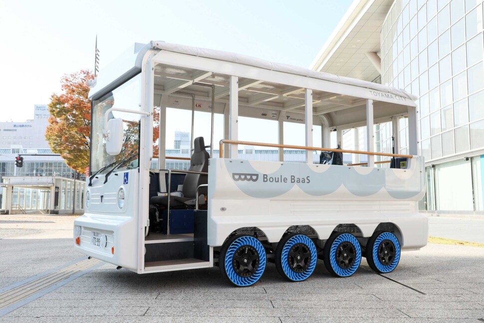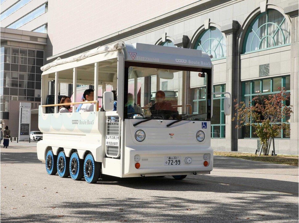 富山市とブリヂストンは、グリーンスローモビリティ運行事業に関する連携協定を2025年2月13日に締結し、公道での実証実験の準備を進めてきた。今回の実証実験は、バスタイプのグリーンスローモビリティ「Boule BaaS」(ブールバース)が運行されている富山駅北エリアで行われる。車両データ・走行データ・メンテナンス状況・利用者アンケートといった多角的なデータを収集することで、「Boule BaaS」と「AirFree」の組合せによる特性や機能、提供価値を富山市とブリヂストンで検証するとともに、2026年の社会実装に向けて活動を推進する。