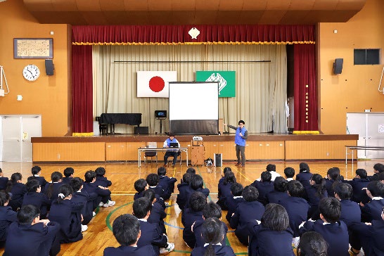 「ブレスエアー」は東洋紡エムシーの敦賀サイトで製造している。出前授業では、まず東洋紡の社員が、敦賀サイトを含む東洋紡敦賀事業所の紹介をした後、東洋紡エムシー社員が「ブレスエアー」の特徴(弾力性、リサイクル性、新幹線の座席シートをはじめとする採用例など)を説明。製造方法については動画を用いて、原料搬入から完成までの流れを紹介した。
