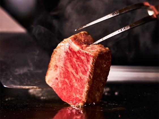 鉄板焼「鉄板焼 和城/Teppanyaki WAJO」は、前菜は季節感を大切にしたモダンな仕立て。和牛ステーキは、醤油と赤ワインを使った二種のソースで変化を楽しむ。