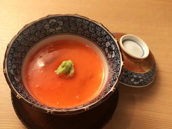 日本料理「なにわ料理 さと有/Naniwaryori Satou」は、親方から器と共に譲り受けた名物が天神紅梅蒸し。梅干しだしの茶碗蒸しに梅肉の餡が寄り添う。