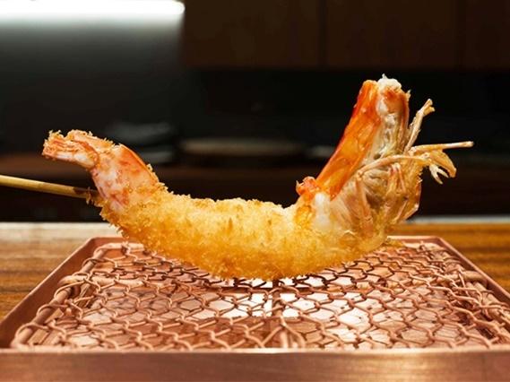 串揚げ「串かつ だいぼん/Kushikatsu Daibon」は、魚好きなことから、串かつコースは魚介が中心。定番の車海老はレアに揚げて甘みを引き出す。