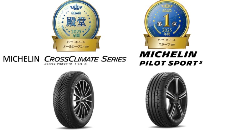 殿堂入りとなった製品は、昨年に引き続きタイヤ(オールシーズン)部門の「MICHELIN CROSSCLIMATE」シリーズとなる。また年間大賞1位にも、昨年に引き続きタイヤ(スポーツ)部門の「MICHELIN PILOT SPORT5」が受賞している。
