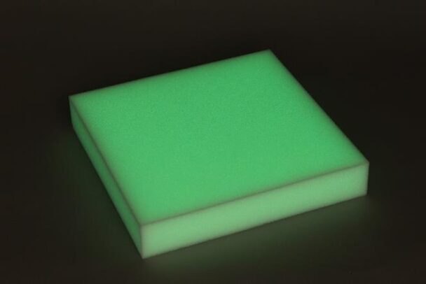 今回発売を開始したルミナイトは、軟質ウレタンフォームの生産段階で蓄光顔料を加えることにより、光を吸収して蓄え、暗所で発光する軟質ウレタンフォーム。軟質ウレタンフォームは液体の原料を発泡させて生産されるが、蓄光顔料のように粉末状のものを加えると均一な発泡が難しく、品質が安定しにくいという問題があった。そこで同社は蓄光顔料を原料の中で安定的に分散させ 、均一な発泡を可能にする手法を新たに確立し、サイズに関係なく光を当てると蓄光する軟質ウレタンフォームを業界で初めて開発した。
