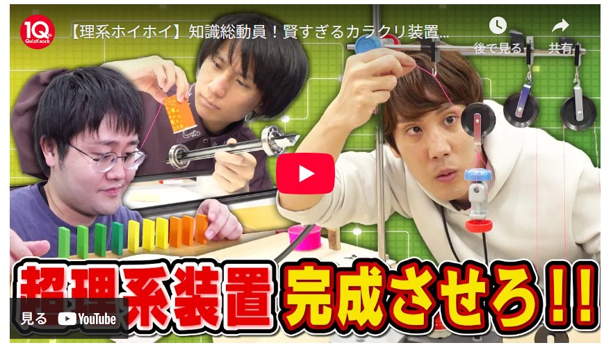 YouTubeチャンネル「QuizKnock」コラボ動画の公開日は、2025年12月19日、タイトルは「【理系ホイホイ】知識総動員!賢すぎるカラクリ装置成功するまで帰れません」となる。知的エンタメ集団「QuizKnock」の須貝駿貴さん・鶴崎修功さん・山本祥彰さんが巨大なカラクリ装置に挑む。装置を完成させなければクイズに答えられないという特別なルールのもと、3人は科学の知識を駆使して未完成のカラクリ装置に挑み、トライ&エラーを繰り返しながら装置の完成を目指す。