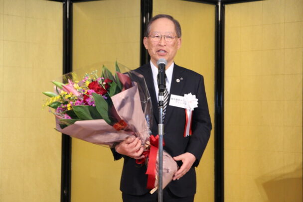 新年互礼会では、慶事の報告も行われた。組合の理事・相談役を務める大西健路氏(宇都宮製作)が、長年にわたる業界および関連分野への貢献が評価され、旭日双光章を受章したことが紹介され、会場から大きな拍手が送られた。花束贈呈の後、大西氏は謝辞に立ち、「これまで多くの方々に支えられて活動してこられた結果。今後もこの受章に恥じぬよう、業界のため力を尽くしたい」と述べた。