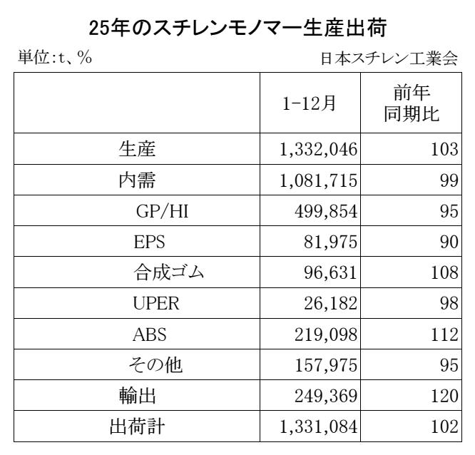 用途別では、主力のPS向け(GP/HI)は49万9854tで同5・0%減となった。また、ABSは21万9098tで同12・0%増、合成ゴムは9万6631tで同8・0%増、EPSは8万1975tで同10・0%減。UPER(不飽和ポリエステル)は2万6182tで同2・0%減となった。
