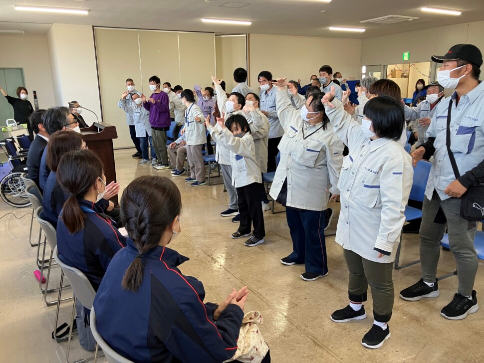 今年度は、愛知県内の2ヵ所と、静岡県周智郡森町の1ヵ所の福祉施設に車イスなど総額 約150万円分の物品を寄贈した。寄贈先の明和会の「ワークスつばさ」では、利用者の方々がお礼に手話を交えた歌を披露し、会場は温かな雰囲気に包まれた。