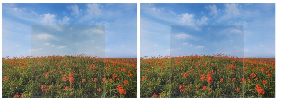 ポジカくっきりフィルムによる視覚効果は、花の赤色、葉の緑色、空の青色はより濃く鮮やかに、雲の白はより白く見える。